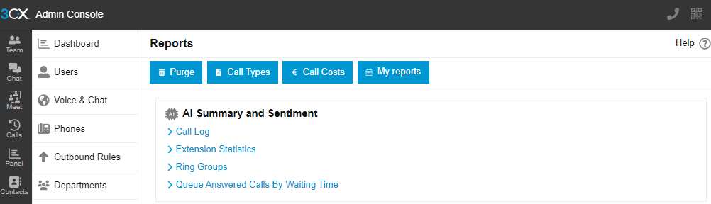 AI data flows into 3CX reports and the recordings page. You track sentiment averages, review transcripts, and scan summaries without extra tools. Your team gets a single view of performance.