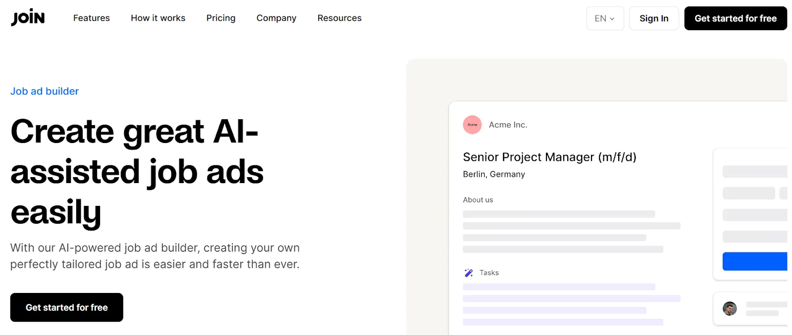 - Tools like JOIN’s AI job ad builder generate complete job ads in minutes with guided customization options. Recruiters can tailor the writing style or focus on different job boards and languages.