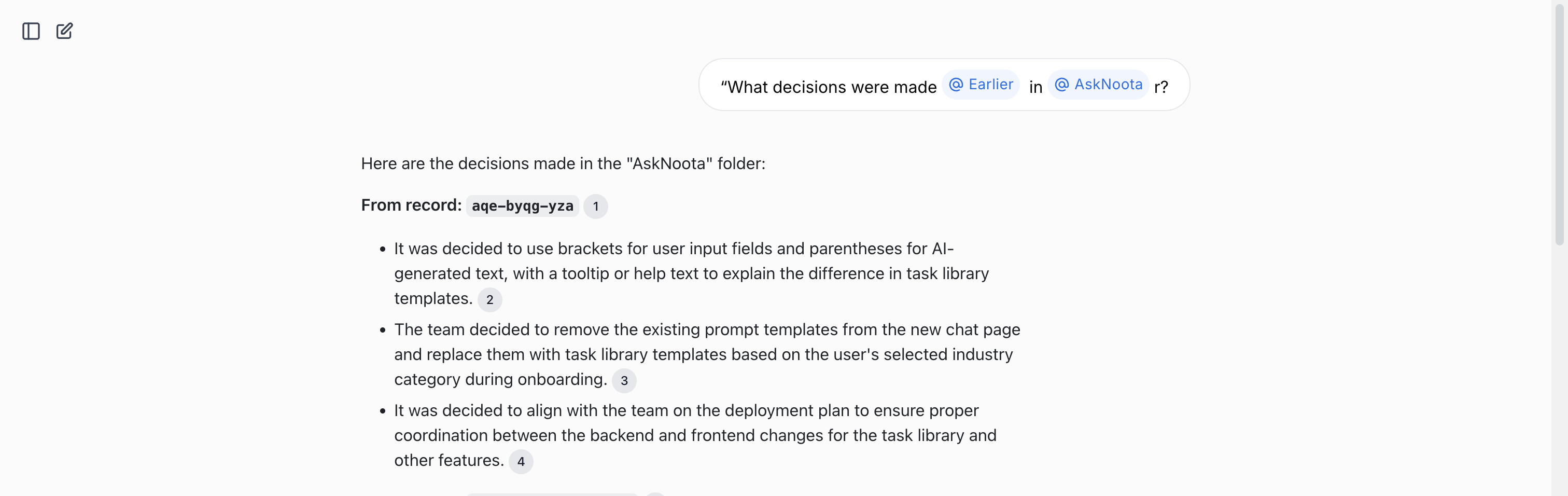 The @ mention system helps Ask Noota answer with precision by referencing your meetings and folders.
