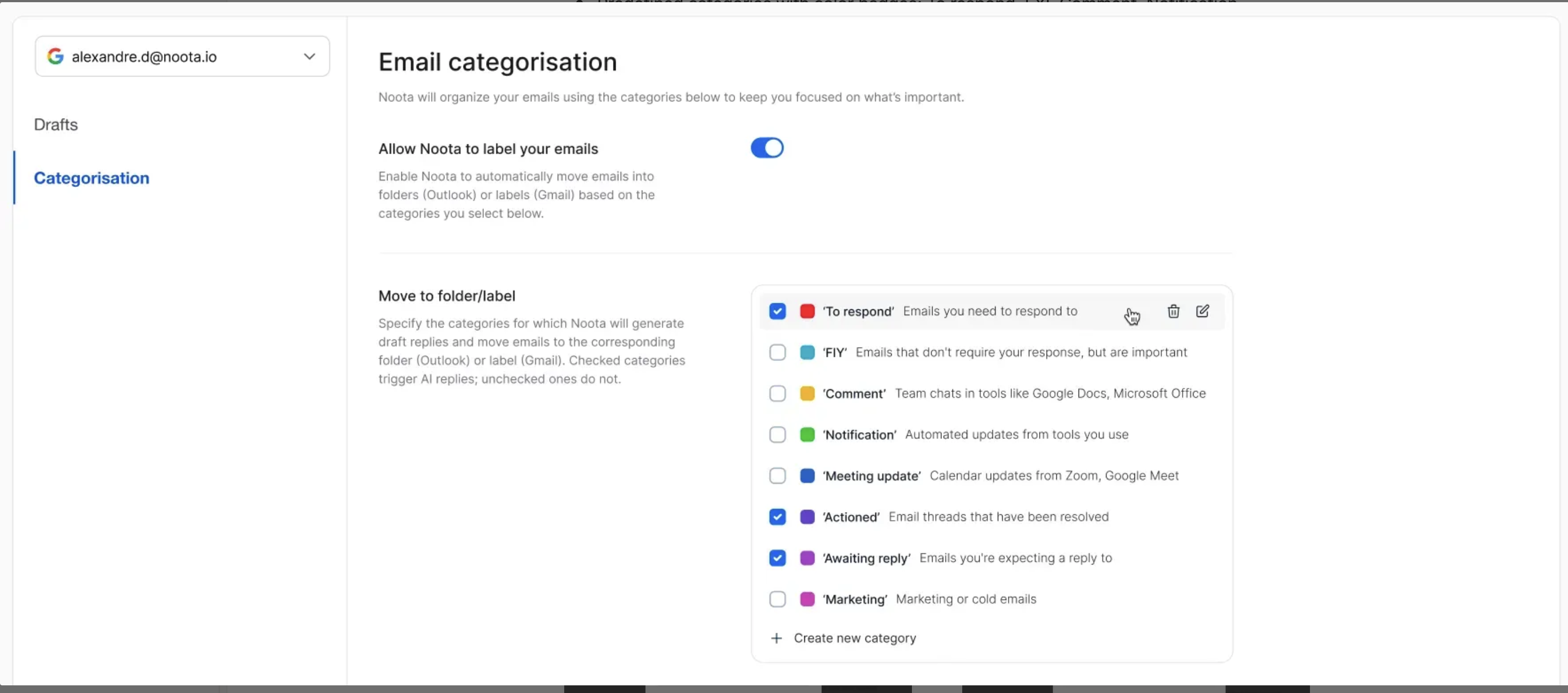 You can also enable auto-drafting for selected labels (e.g., always create a draft for “To respond”).