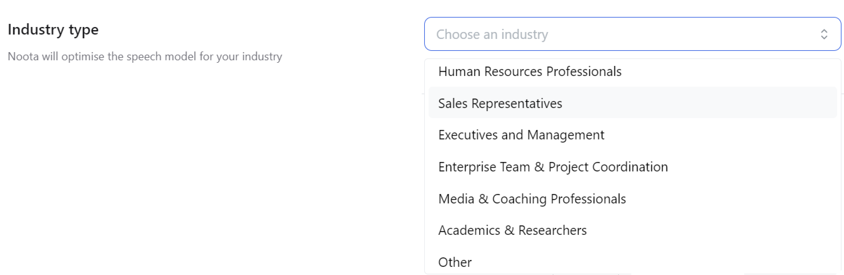 Select an industry, as it helps the platform optimize its speech models based on the chosen sector. This ensures better accuracy in recognizing specific terms and speech patterns relevant to the industry.