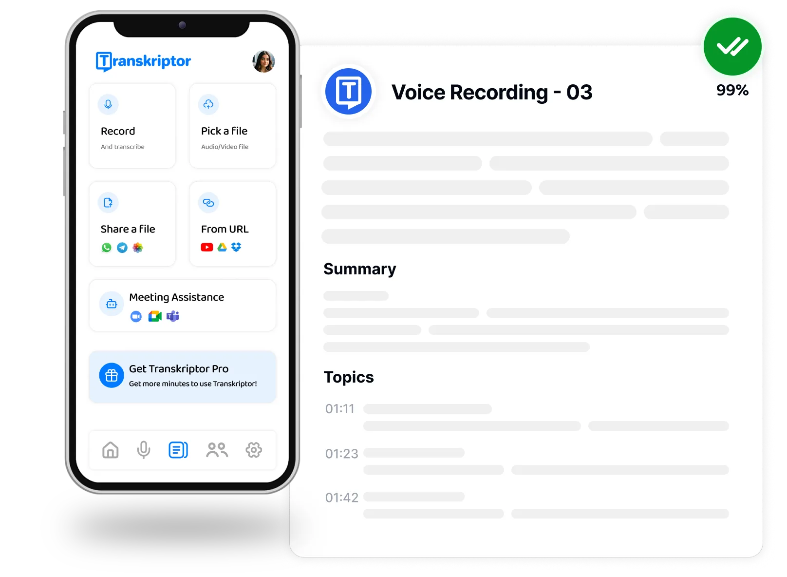 After each call, Transkriptor can generate concise summaries, highlighting key points and action items. This feature saves time and helps you quickly grasp the essence of lengthy conversations.