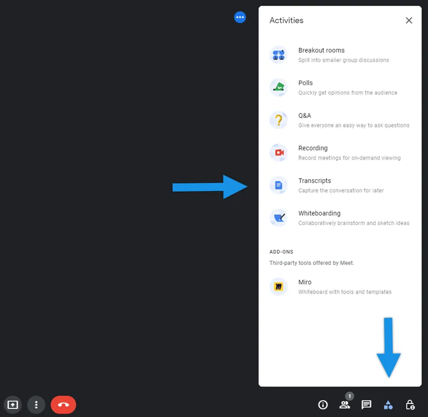 You join a meeting on Google Meet, click Activities → and you don’t see “Transcripts” (or “Start transcription”) in the menu.
