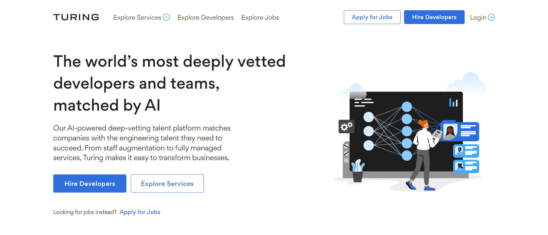 Turing es una plataforma respaldada por la inteligencia artificial que permite a las empresas contratar desarrolladores de software remotos previamente examinados de un grupo de talentos global.