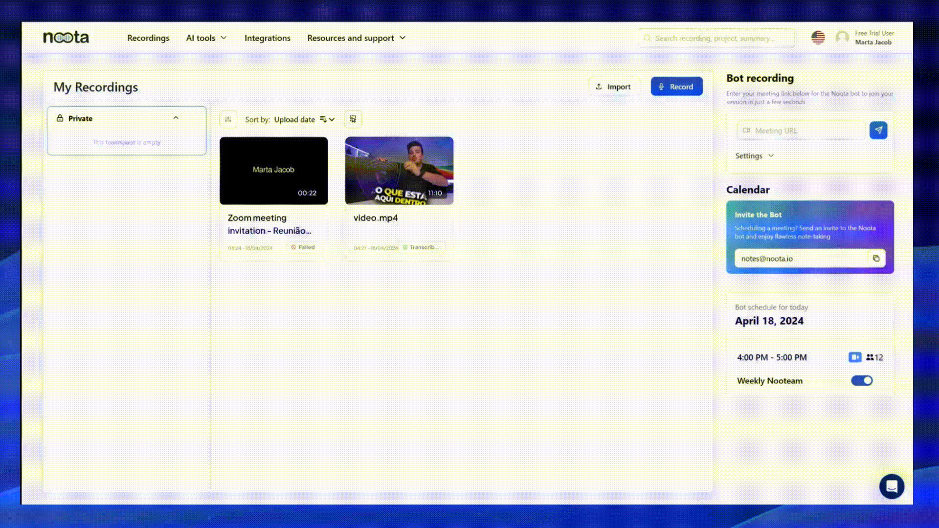 Noota propose une fonctionnalité exceptionnelle qui s'intègre aux événements de votre calendrier pour rejoindre automatiquement des réunions sur des plateformes telles que Zoom, Google Meet et Microsoft Teams. Cependant, il peut arriver que vous préfériez désactiver cette participation automatique.