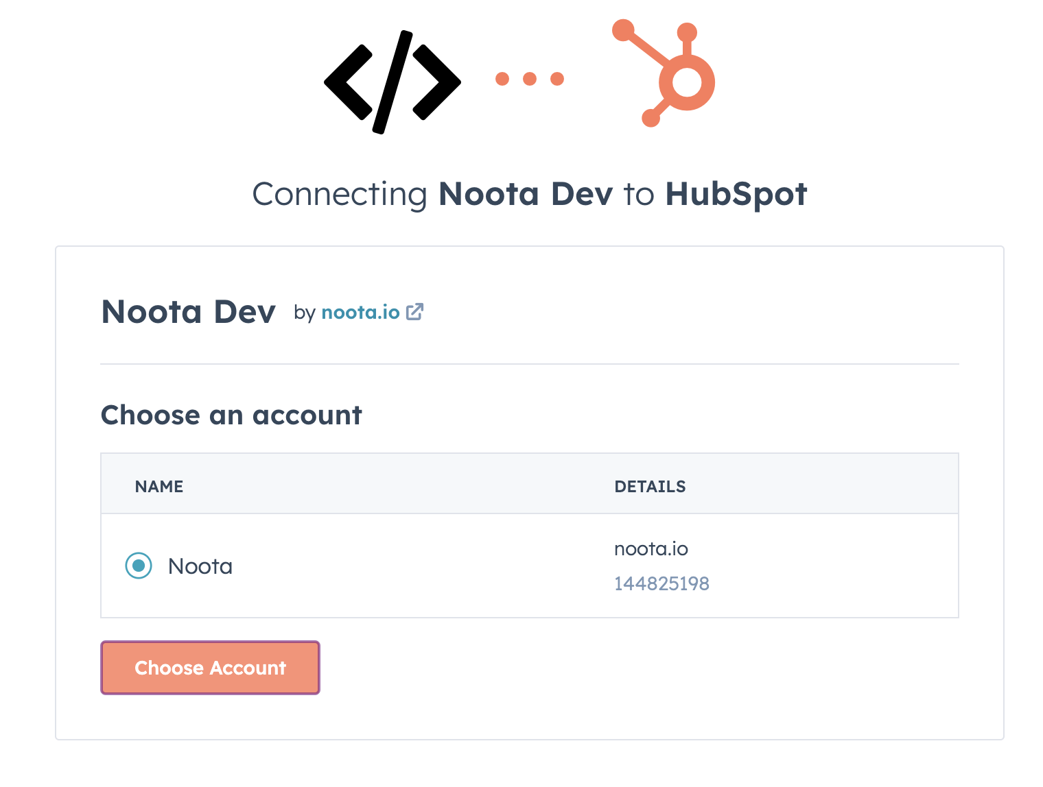 Après vous être connecté, il vous sera demandé de choisir le compte HubSpot avec lequel vous souhaitez vous connecter à Noota.