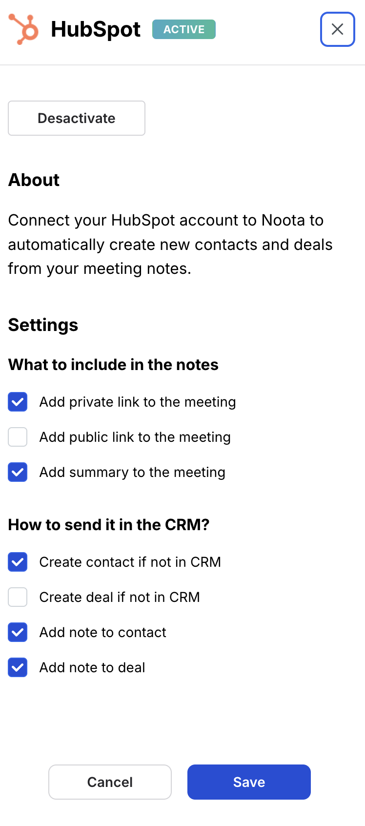 Recherchez HubSpot sur vos intégrations Noota et cliquez sur le bouton Activer.