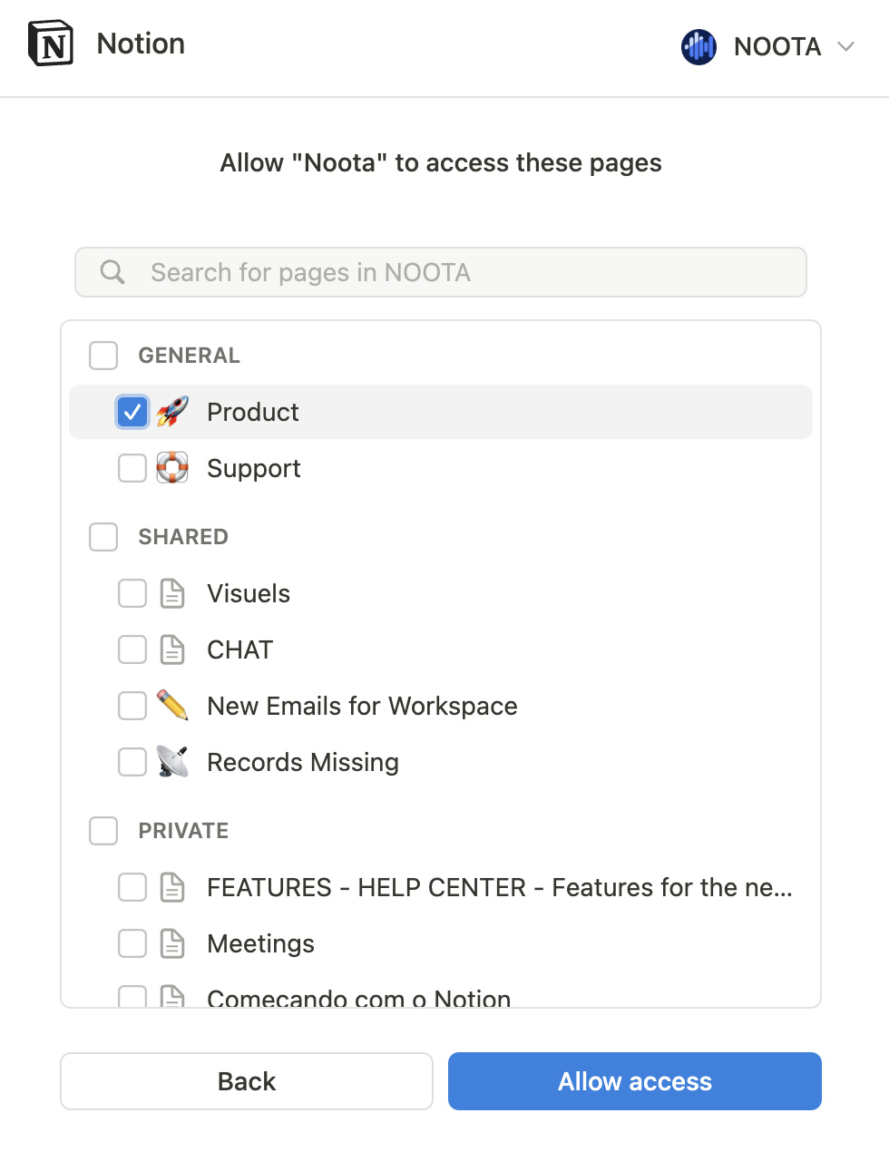 💡 Notion vous permet de sélectionner des pages spécifiques auxquelles Noota peut accéder, afin que vos notes privées restent intactes.