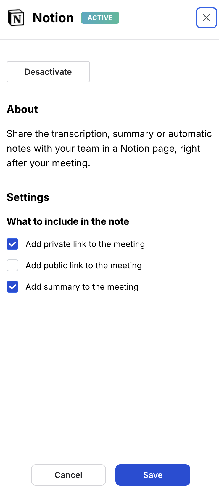 Une fois l'intégration réussie, vous verrez que Notion est désormais actif dans Noota.