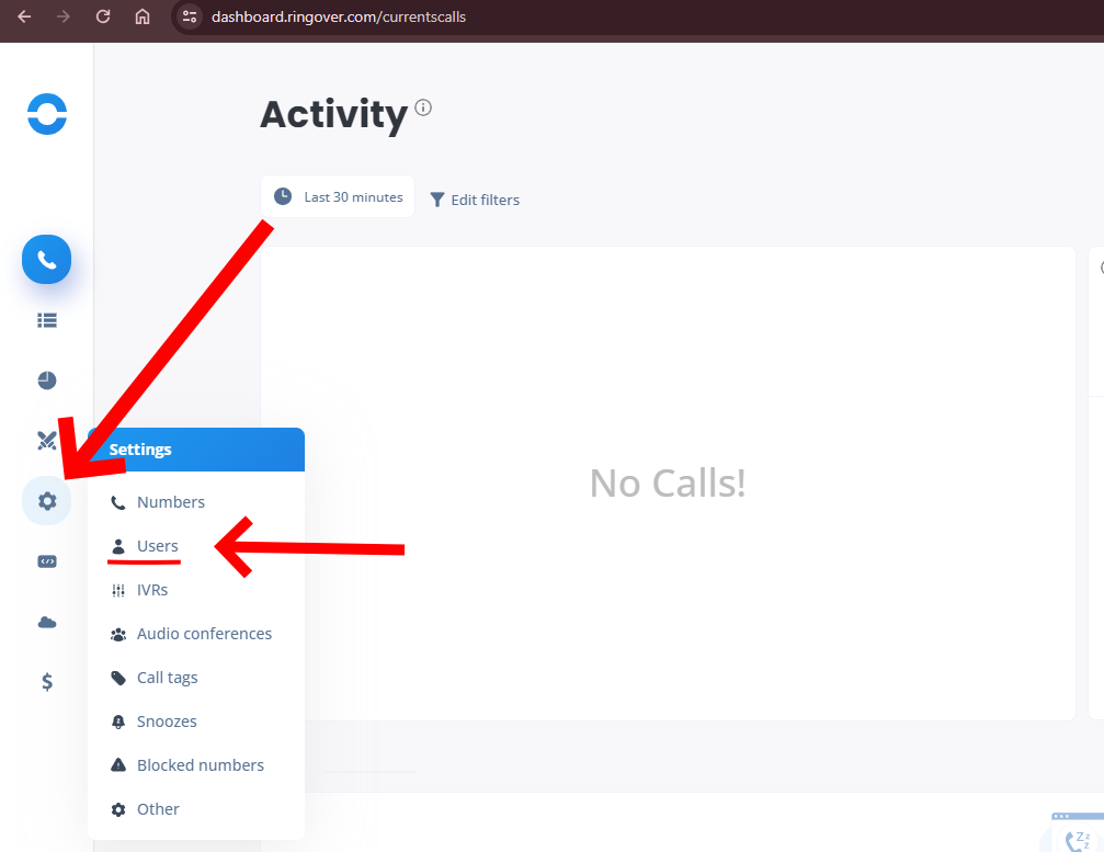 a. Dans le tableau de bord Ringover, allez dans le menu «Paramètres», sélectionnez «Utilisateurs»: