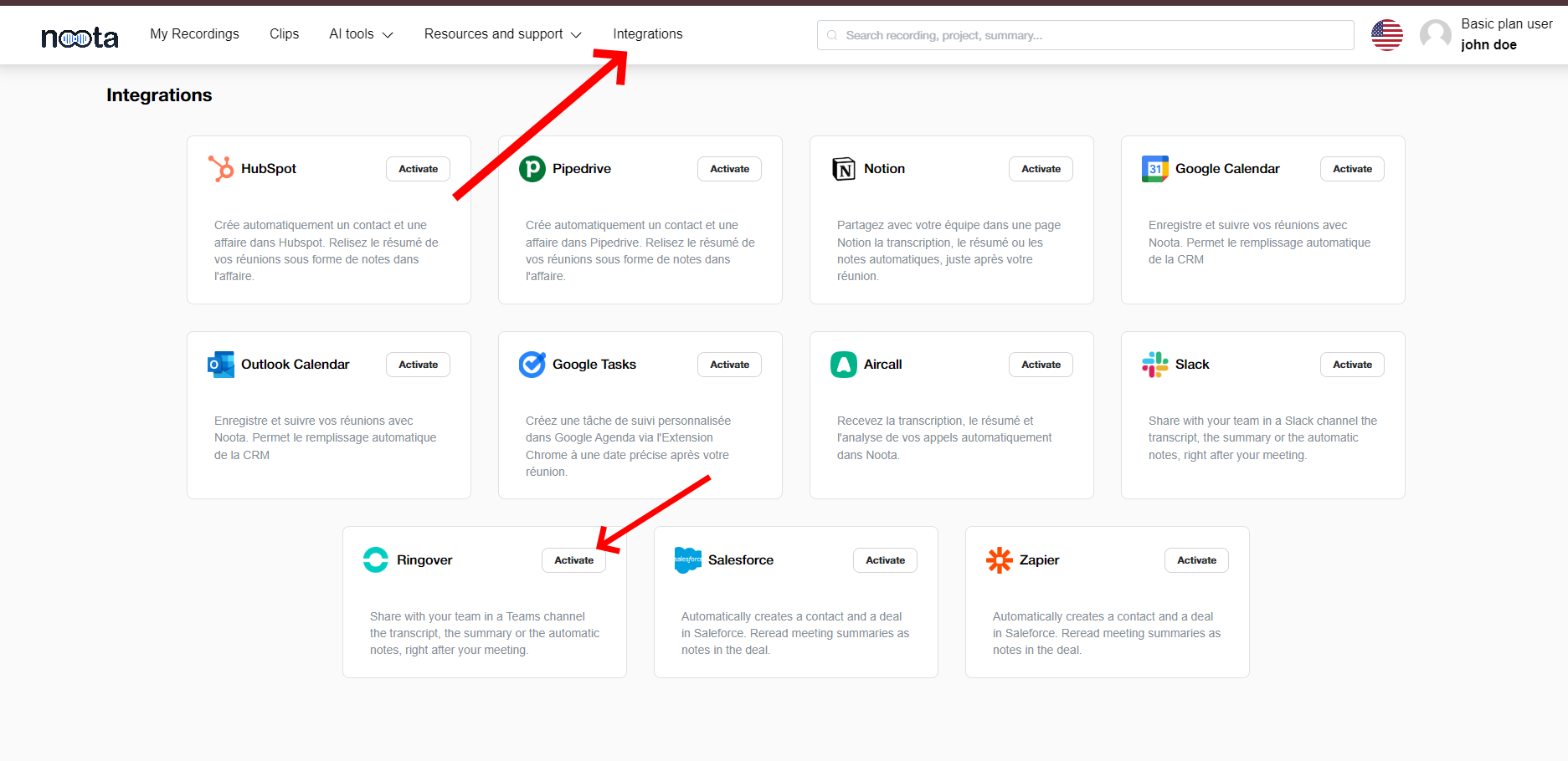 a. Dans le menu supérieur de la plateforme Noota, accédez à Intégration: