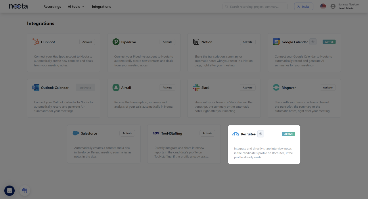 Votre tableau de bord Noota devrait maintenant afficher Recruitee comme une intégration active, prête à améliorer votre processus de recrutement.