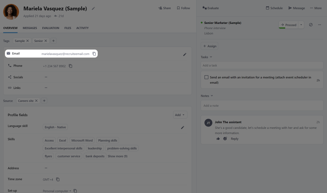 Une fois partagé, le résumé de l'entretien sera accessible (sous Fichiers) dans Recruitee pour une révision et une collaboration faciles.