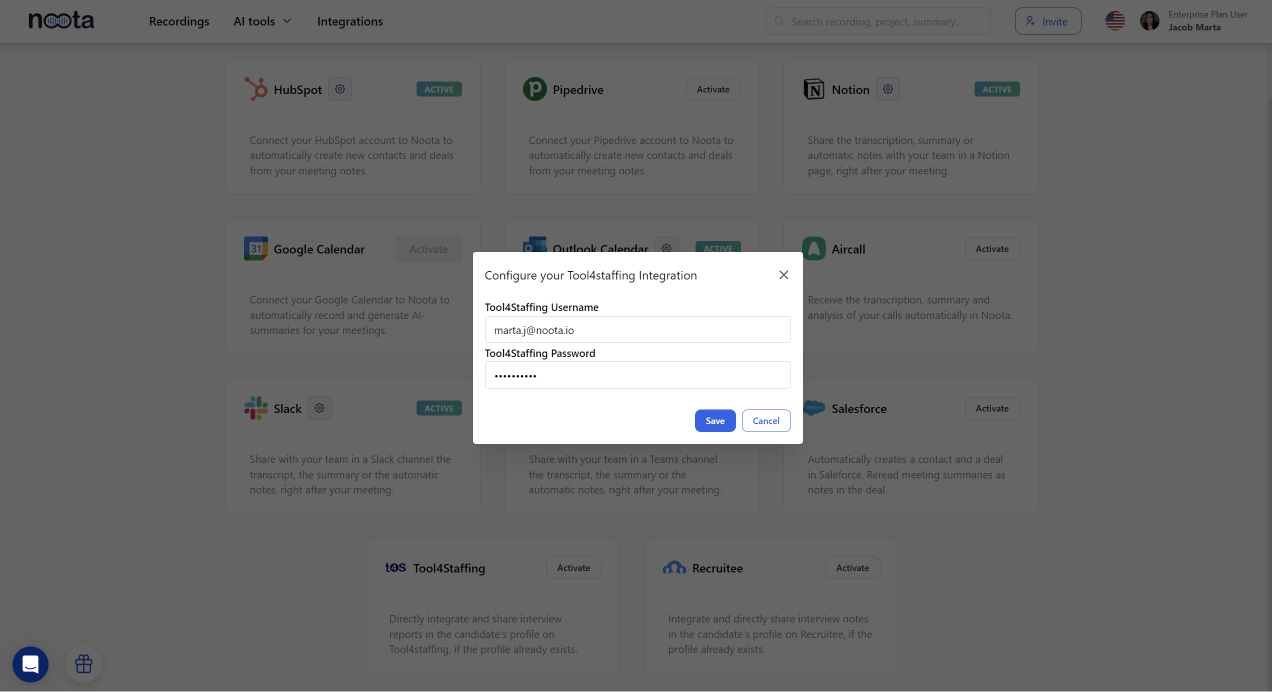 Votre tableau de bord Noota devrait maintenant afficher Tool4Staffing comme une intégration active, prête à améliorer votre processus de recrutement.