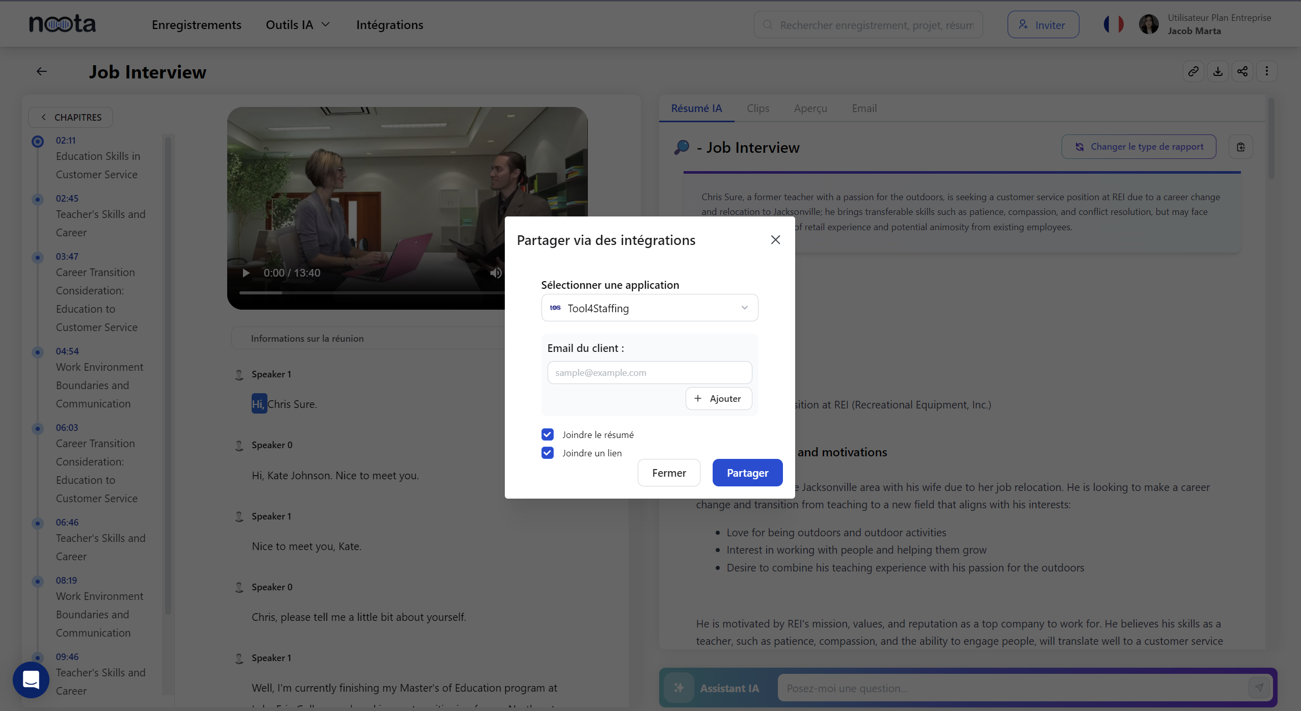 Après avoir terminé une entrevue, suivez ces étapes pour partager le résumé via l' intégration Tool4Staffing :