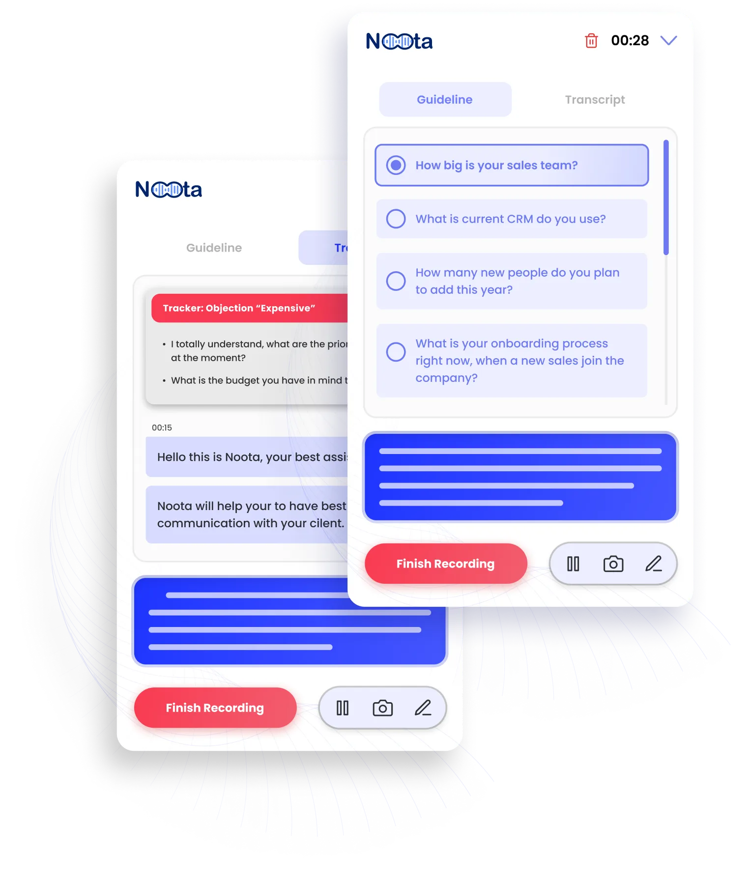 - Pense bête : Fini les oublis ! Noota vous rappelle les questions clés à poser pendant l'entretien. C'est comme avoir un pense-bête intégré qui s'assure que vous couvrez tous les aspects essentiels.