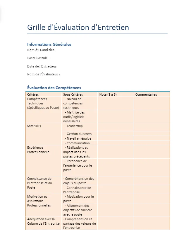 Parfait, maintenant que vous avez les bases, voici un template de grille d'évaluation à remplir. Cet outil vous permet de passer au crible chaque candidat avec précision. La grille est structiurée autour des critères et sous-critères qu'on a déjà discutés, en utilisant une échelle de 1 à 5 pour chaque critère.