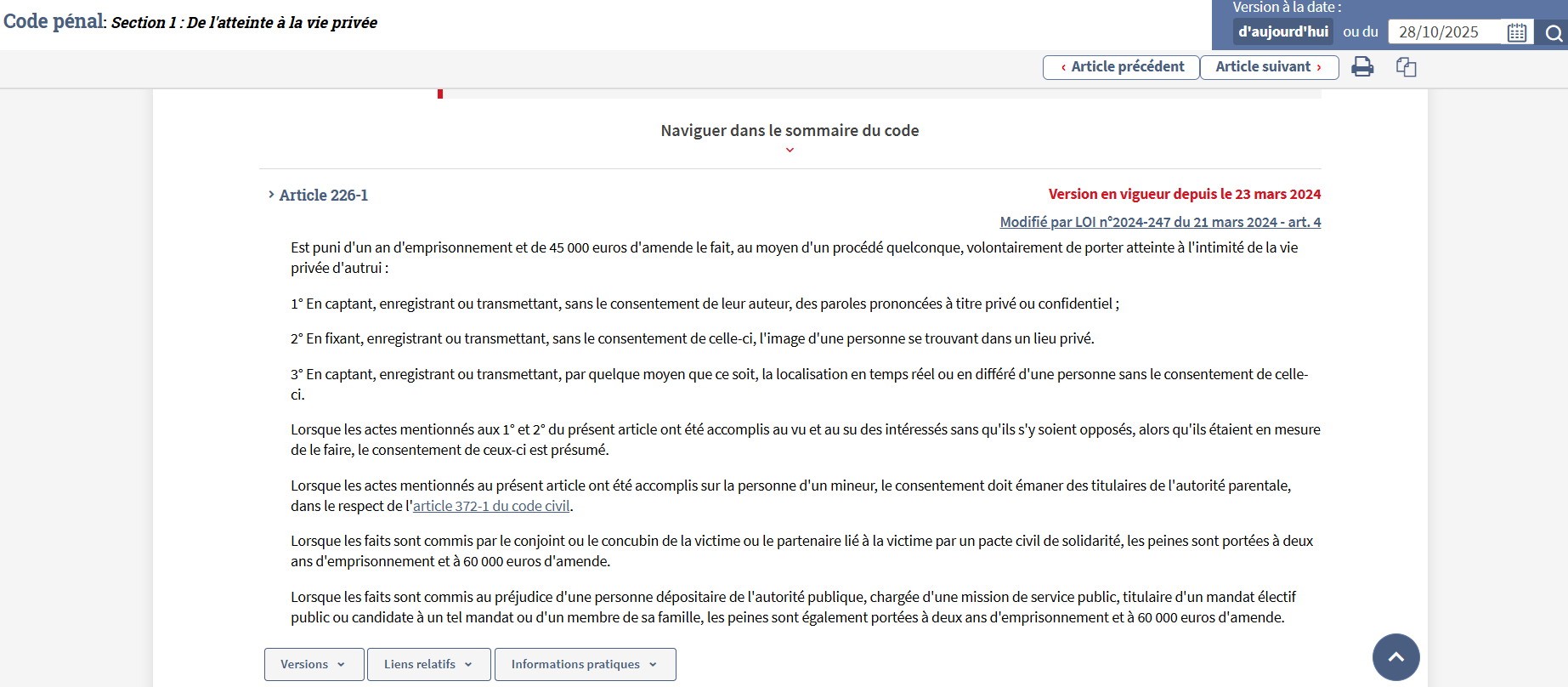 "Est puni d'un an d'emprisonnement et de 45 000 euros d'amende le fait, au moyen d'un procédé quelconque, volontairement de porter atteinte à l'intimité de la vie privée d'autrui :
