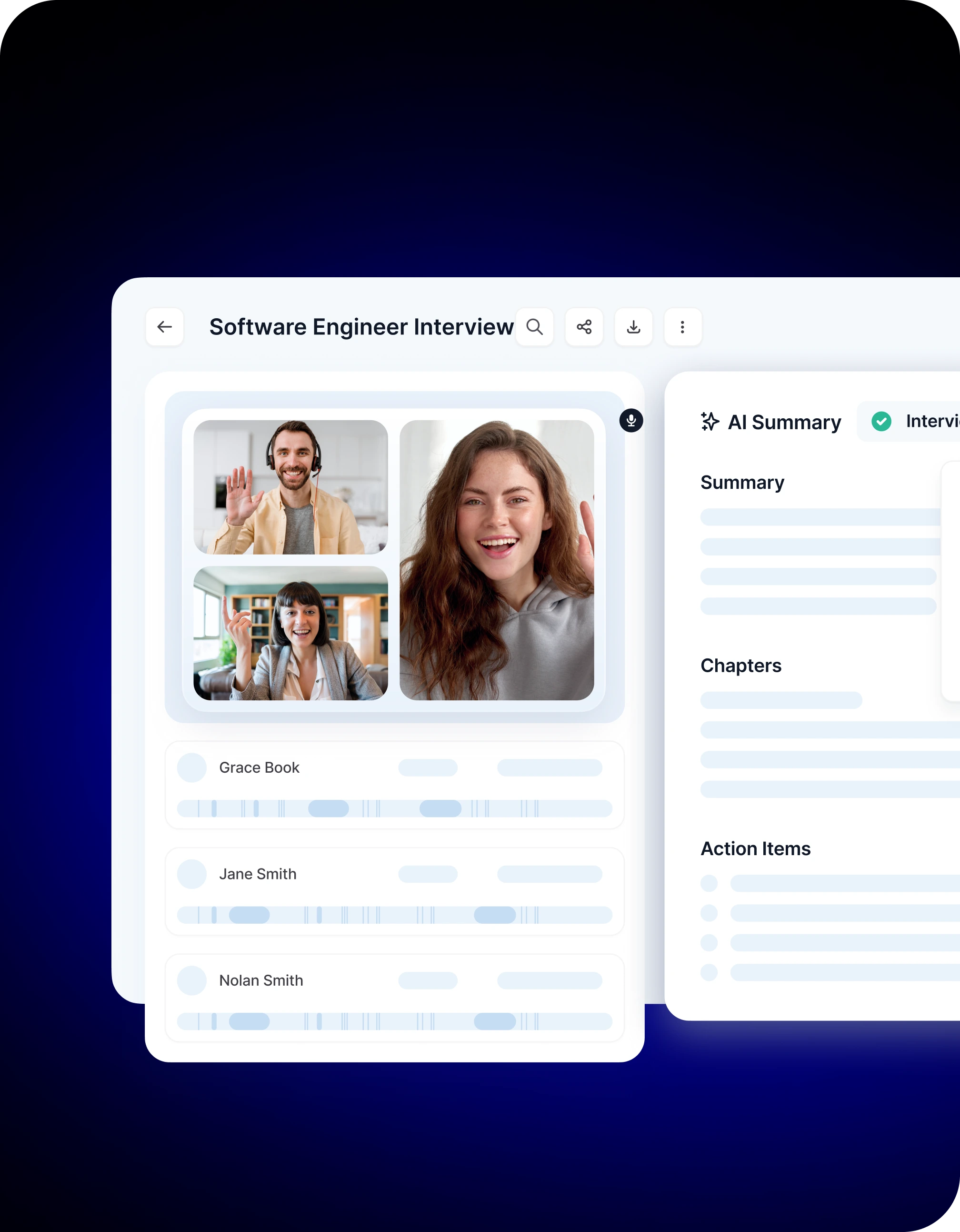 - Transcription automatique : Chaque interview vidéo est enregistrée et convertie en texte précis afin que vous ne perdiez jamais un mot.
