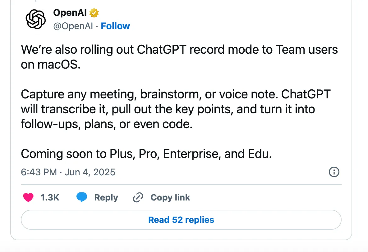 All'inizio di giugno 2025, OpenAI ha lanciato «ChatGPT Record», progettato per fungere da assistente alle riunioni integrato.
