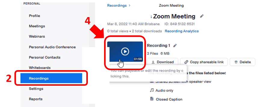 - Gehe zu „Besprechungen“ > „Aufgenommen“ um auf Cloud-Aufzeichnungen zuzugreifen.