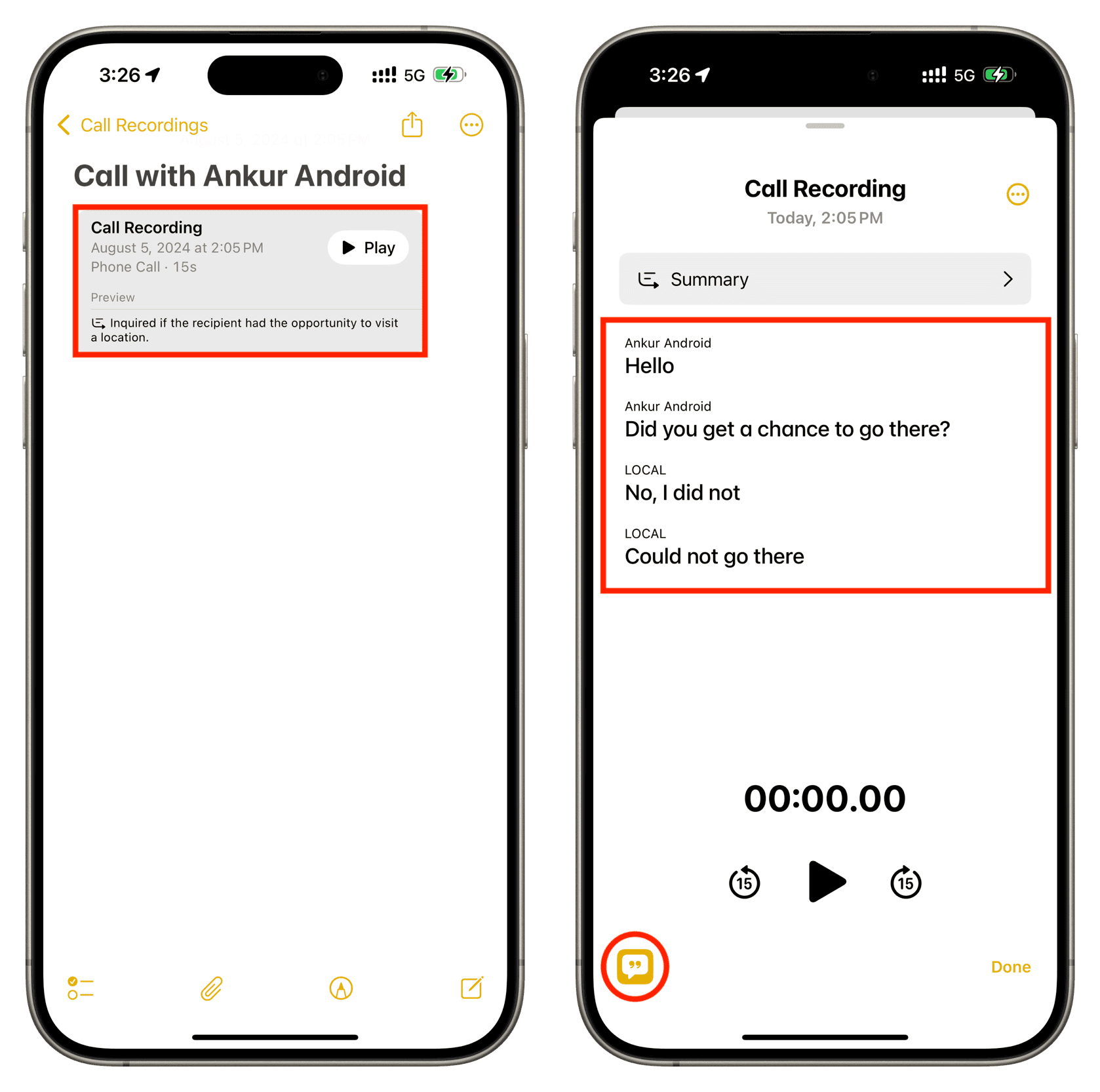 - Nach Beendigung des Anrufs speichert Ihr iPhone beide Audioaufnahme und ein Texttranskription.