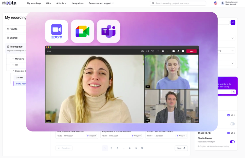 Microsoft Teams verfügt über eine Aufnahmefunktion, erfasst jedoch nicht das gesamte Bild. Hier kommt Noota AI ins Spiel. Dieses KI-gestützte Tool geht über die Aufzeichnung hinaus, indem es Besprechungen in Echtzeit transkribiert und zusammenfasst, sodass Sie nie wichtige Informationen verpassen.
