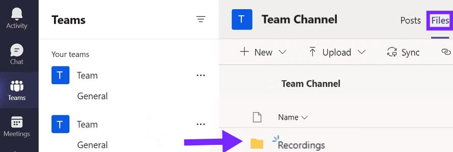 Wenn Ihr Meeting unter einem Teams-Kanal stattfindet, wird die Aufzeichnung im zugehörigen Sharepoint Mappe. Insbesondere wird es in einem“ erscheinenAufzeichnungen„Ordner innerhalb des Kanals Datei Tab.