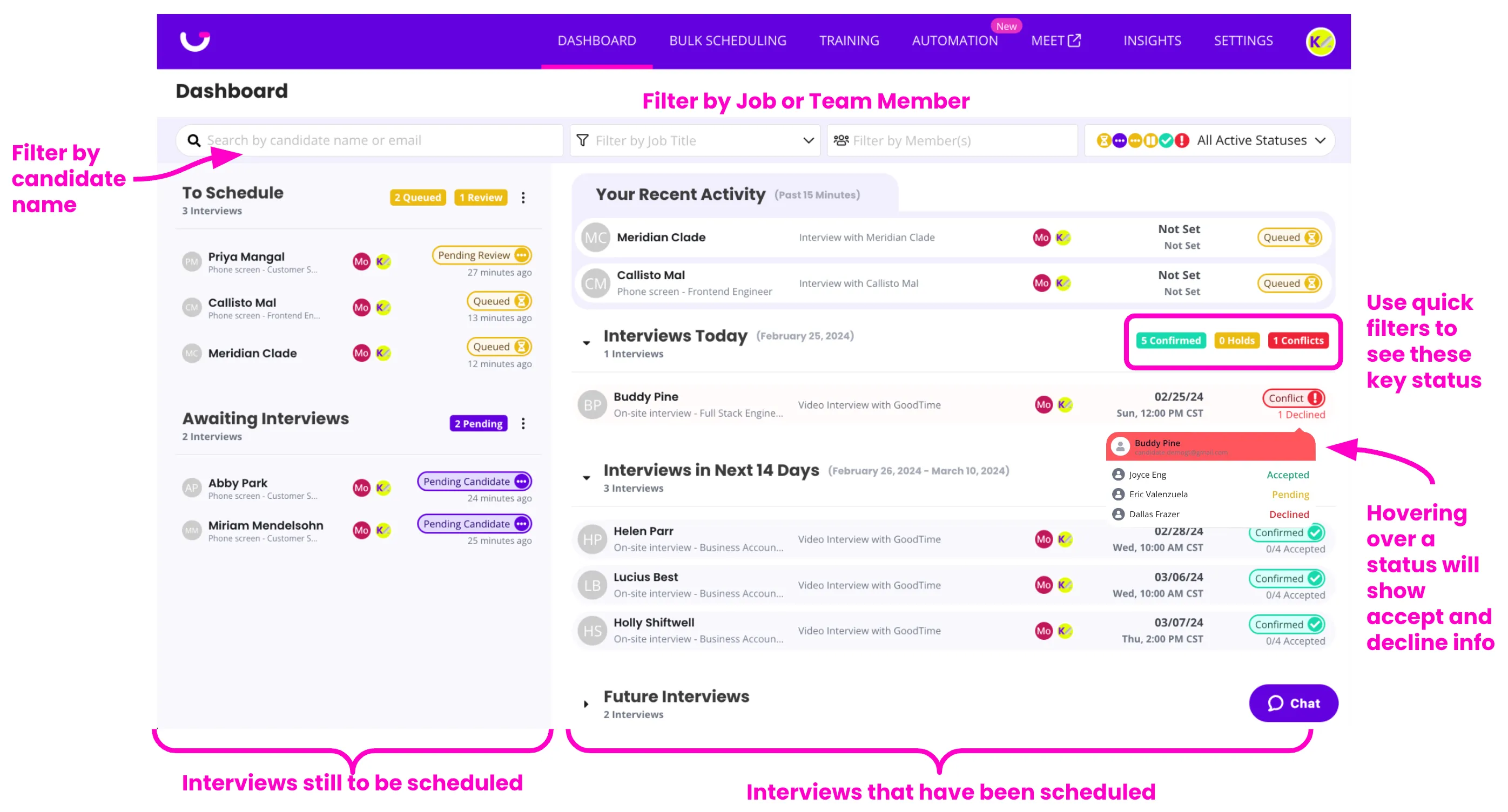 GoodTime is built for enterprise-scale interview workflows. Its AI orchestrates candidate, interviewer, and hiring manager calendars, suggests ideal slots, and handles panel coordination automatically. It’s particularly strong for teams with complex interview loops and heavy hiring volumes.