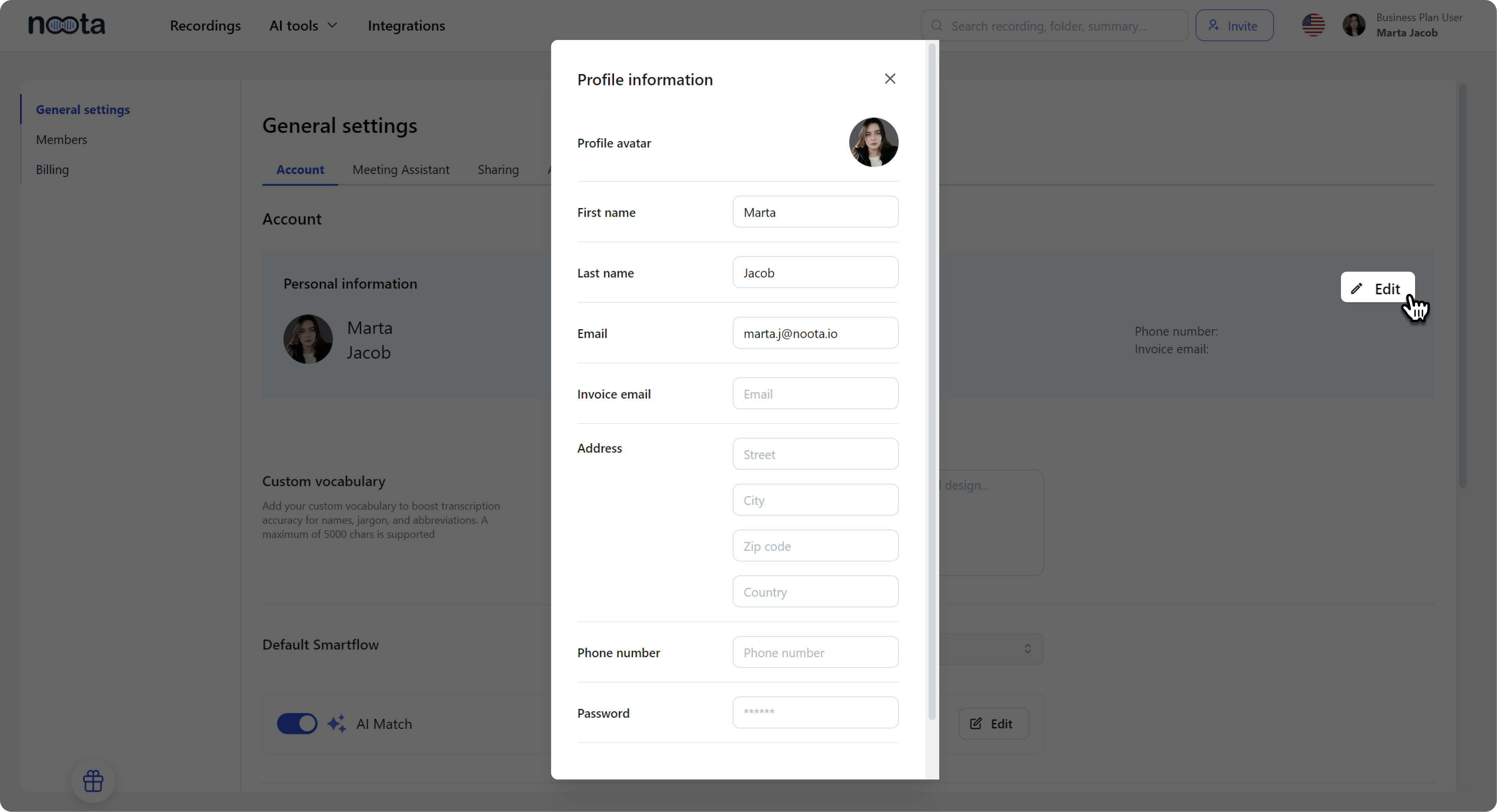 The General Settings section allows you to manage key aspects of your account and configure settings that affect how you interact with Noota.