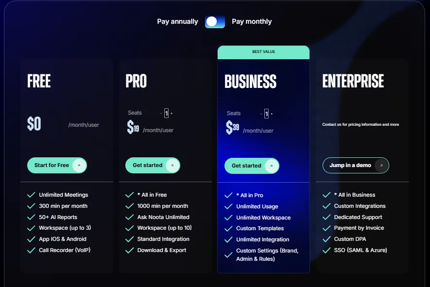 Of course, the free plan comes with limits. For example, you won’t get as many transcription minutes as with a paid plan. Some advanced features, like deeper analytics or CRM integrations, are only available in Pro or Team versions.