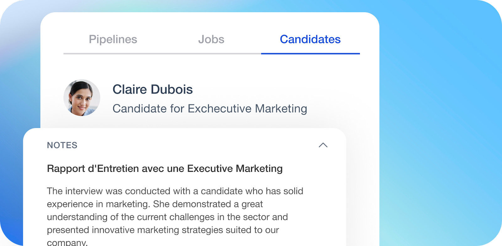 Noota listens to and records every word of your interviews, transcribing them in real time. It also analyzes candidates' answers according to the skills and criteria you've defined :