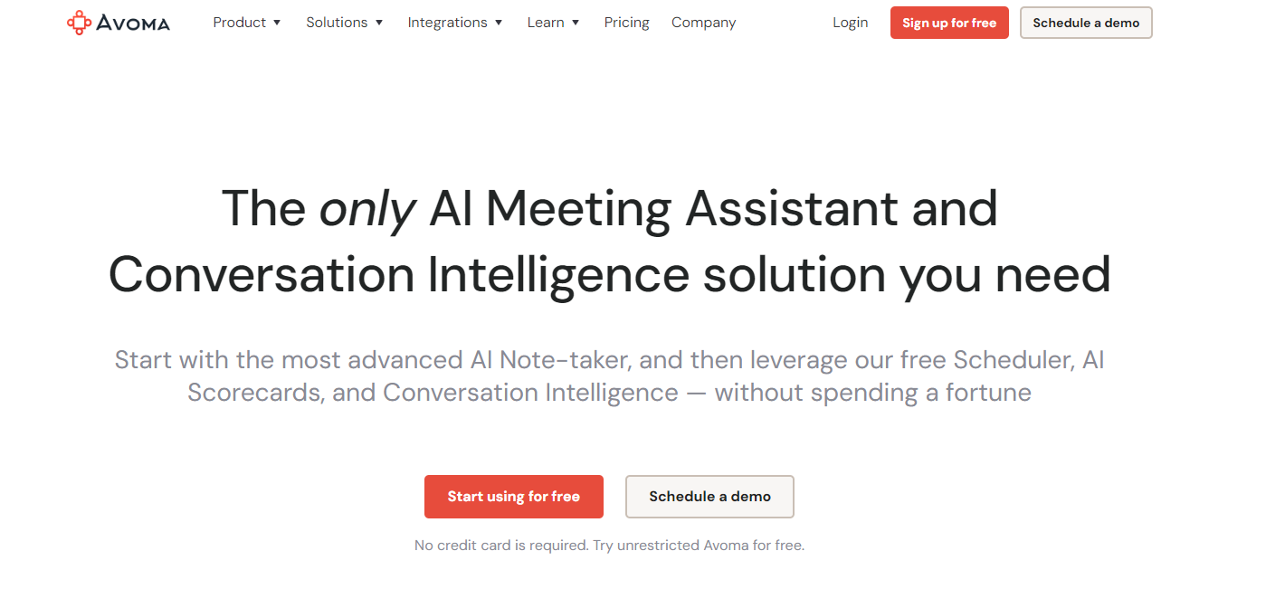 Avoma proporciona notas y resúmenes generados por IA, integraciones de CRM y toma de notas colaborativa. Realiza un seguimiento de las menciones competitivas durante las reuniones y ofrece un análisis detallado. Avoma es ideal para el análisis exhaustivo de las reuniones y el seguimiento de las conversaciones, pero tiene un precio inicial más alto y requiere un correo electrónico empresarial para registrarse.