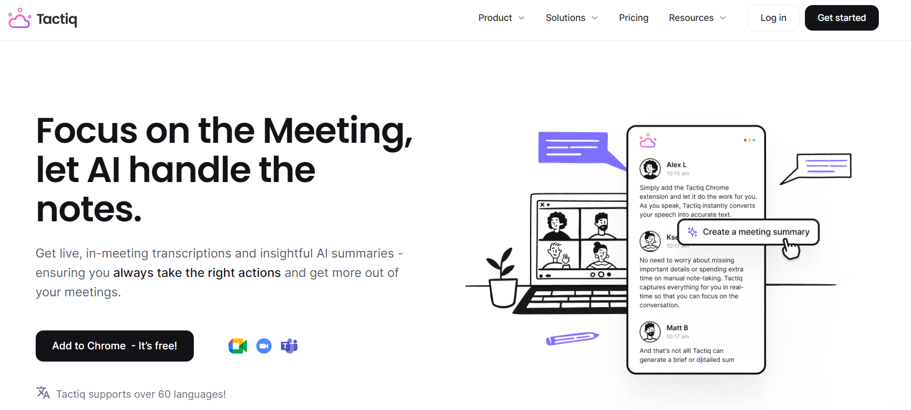Tactiq ofrece transcripciones en tiempo real y admite más de 60 idiomas. Resume las reuniones y permite la asignación de tareas en función de las discusiones. Si bien Tactiq admite varios idiomas y cuenta con un servicio de atención al cliente eficiente, su plan gratuito es débil, carece de inteligencia para múltiples reuniones y tiene un cumplimiento cuestionable de la seguridad de los datos.
