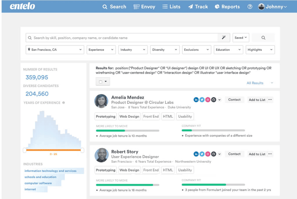 Entelo utiliza el análisis predictivo y la inteligencia artificial para identificar e involucrar a los mejores talentos de manera eficiente.