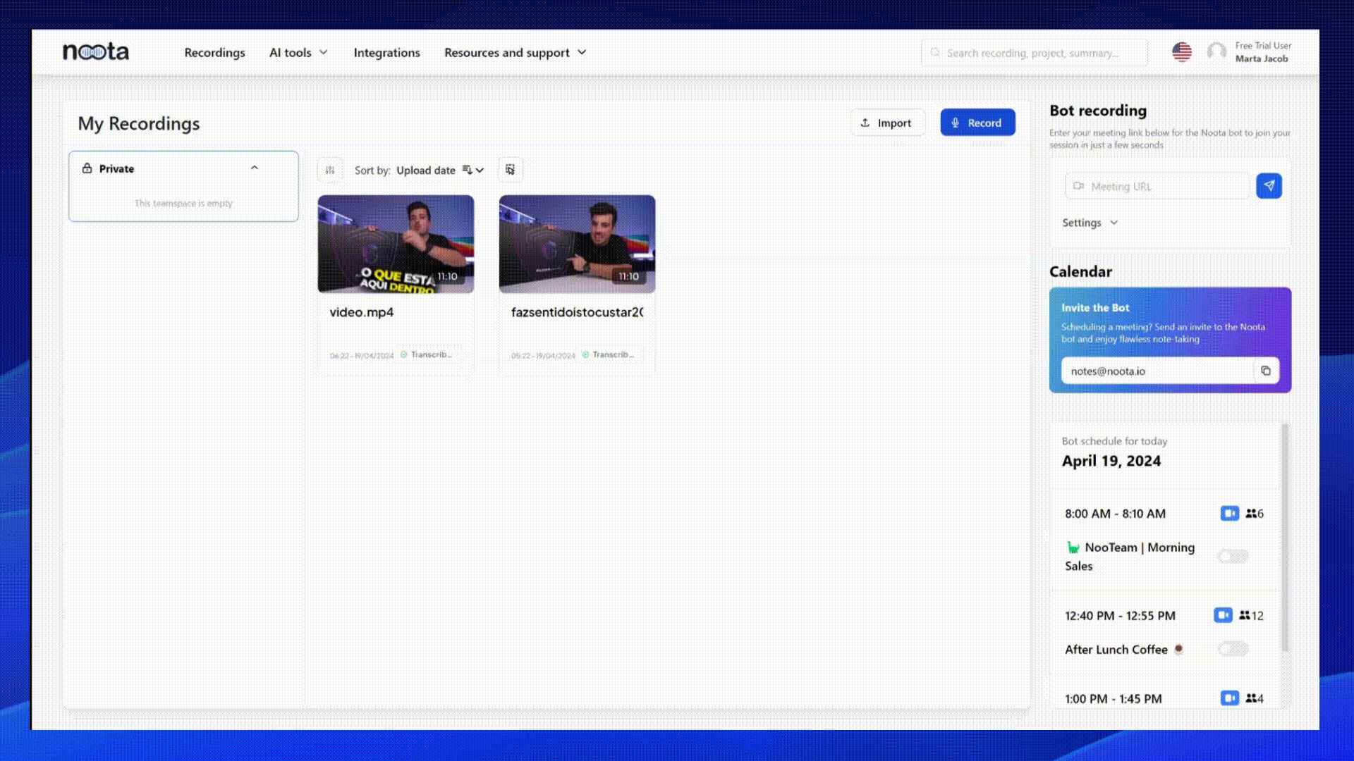Sur votre tableau de bord Noota, localisez et cliquez sur Importer situé sur le côté droit de l'écran.