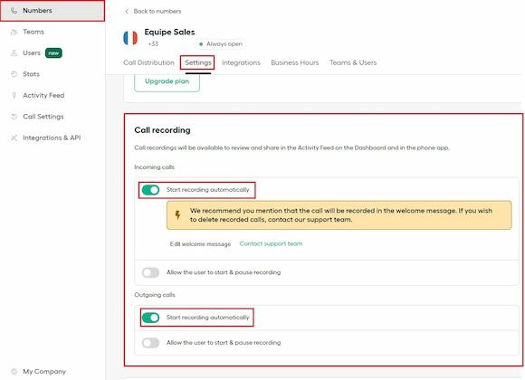 Activer l'enregistrement des appels : cochez les cases "Démarrer l'enregistrement automatiquement pour les appels entrants" et "Démarrer l'enregistrement automatiquement pour les appels sortants". (Voir la capture d'écran ci-dessous pour référence.)