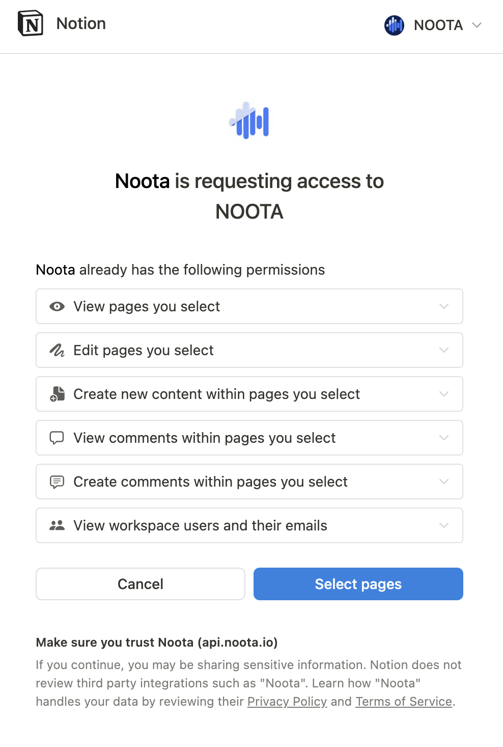 💡 Notion vous permet de sélectionner des pages spécifiques auxquelles Noota peut accéder, afin que vos notes privées restent intactes.