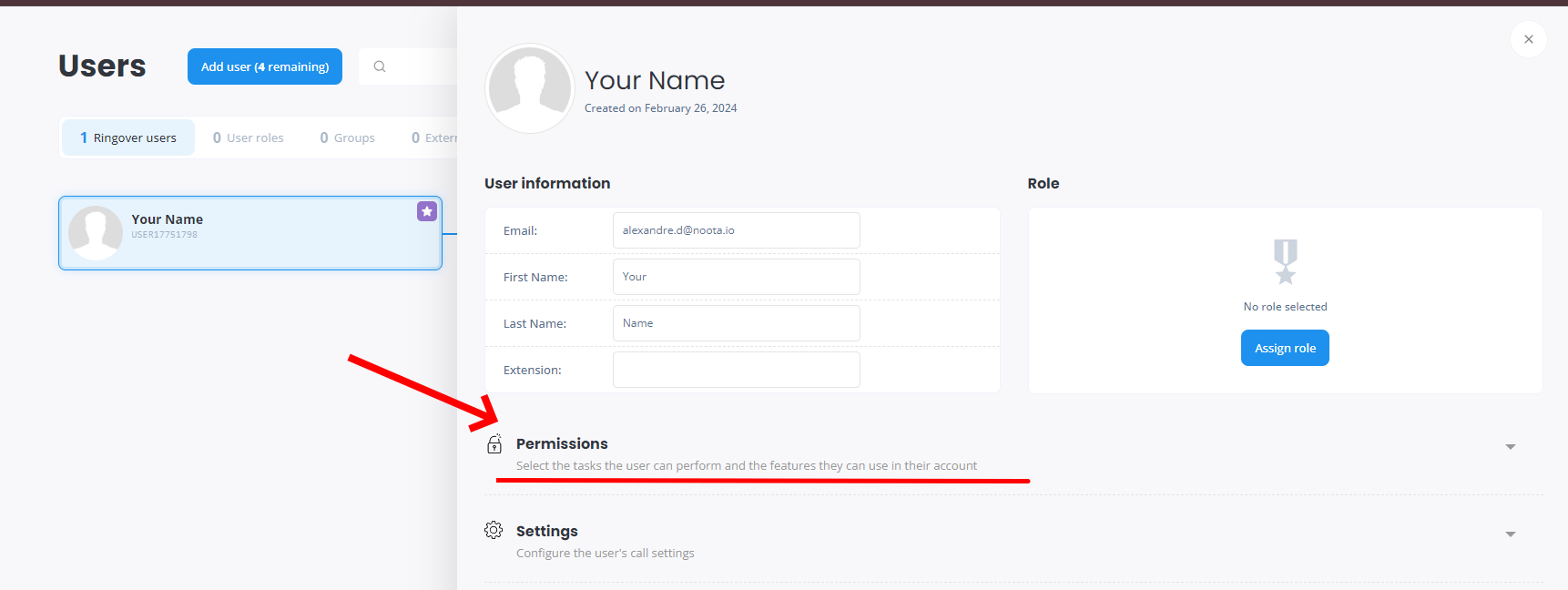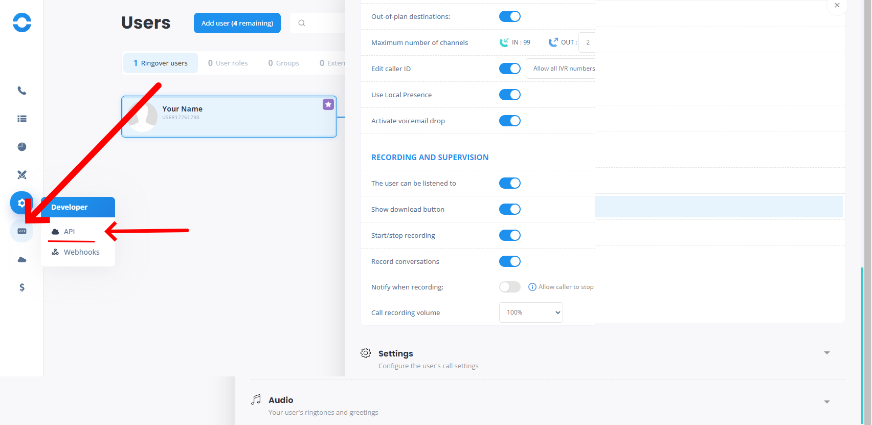 a. Dans le tableau de bord Ringover, allez dans le menu «Paramètres», sélectionnez «Utilisateurs»: