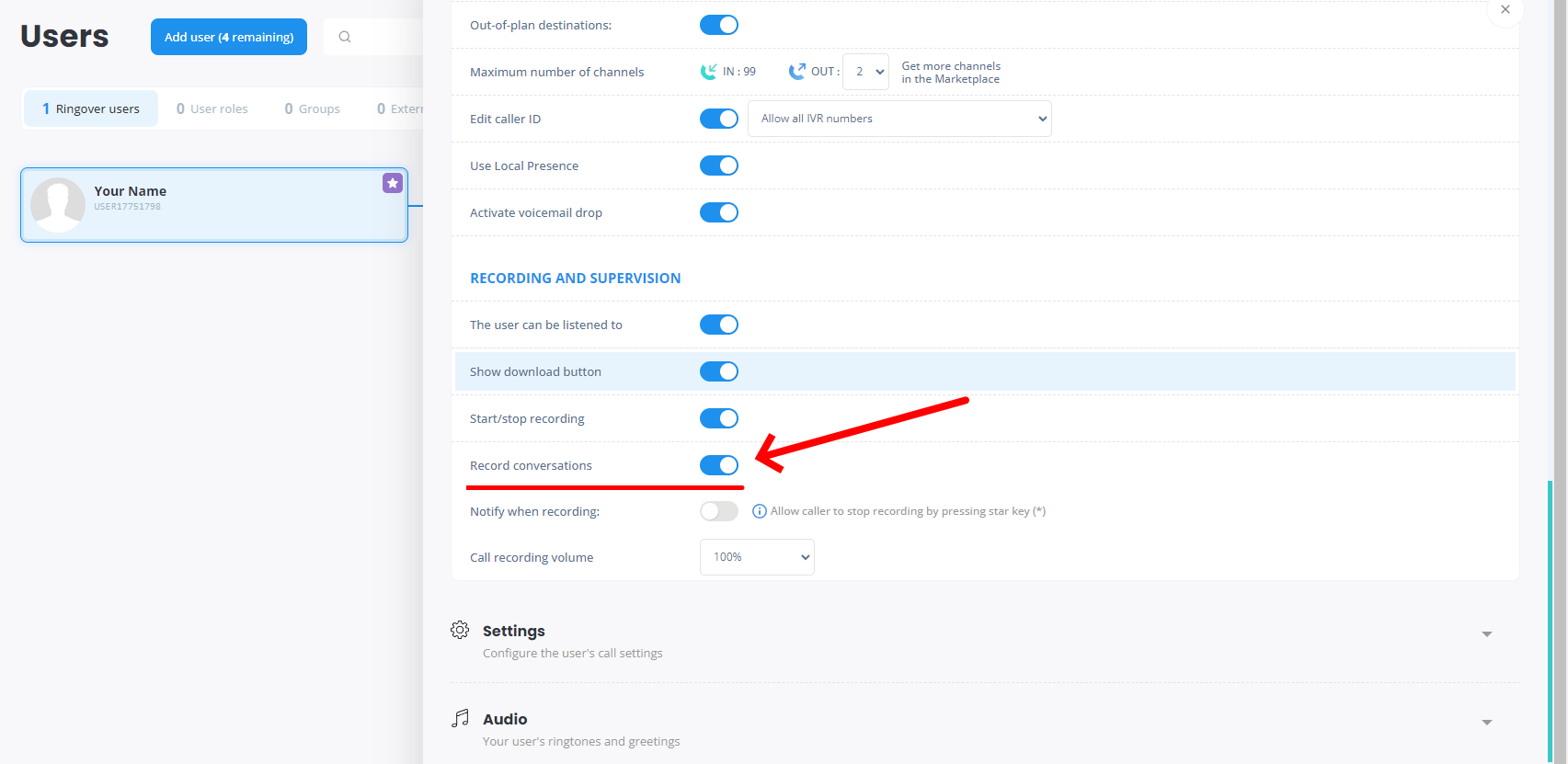 b. Modifiez l'utilisateur et activez les autorisations «Enregistrer les conversations»: