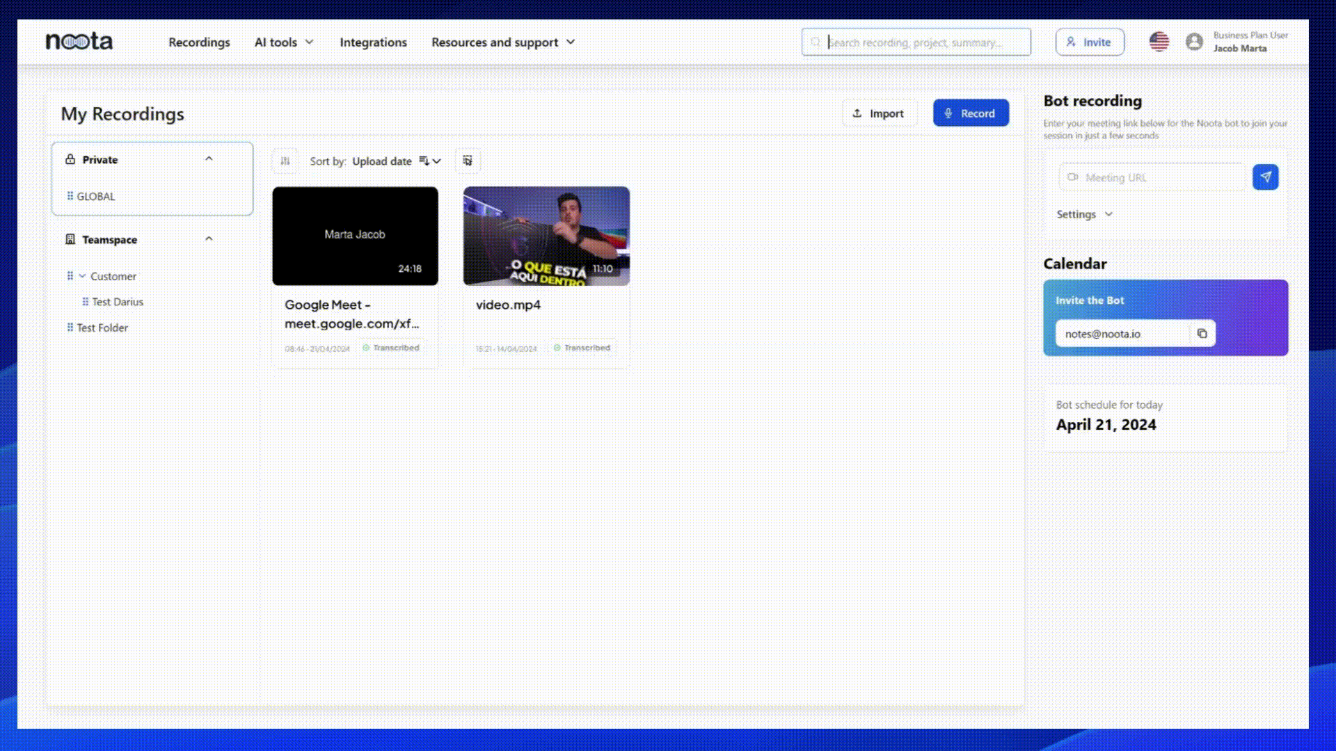 Pour utiliser la recherche globale, accédez simplement à la barre de recherche située bien en vue dans votre tableau de bord Noota. Saisissez votre requête et Noota s'occupera du reste, affichant des résultats pertinents dans tous les coins de votre compte.