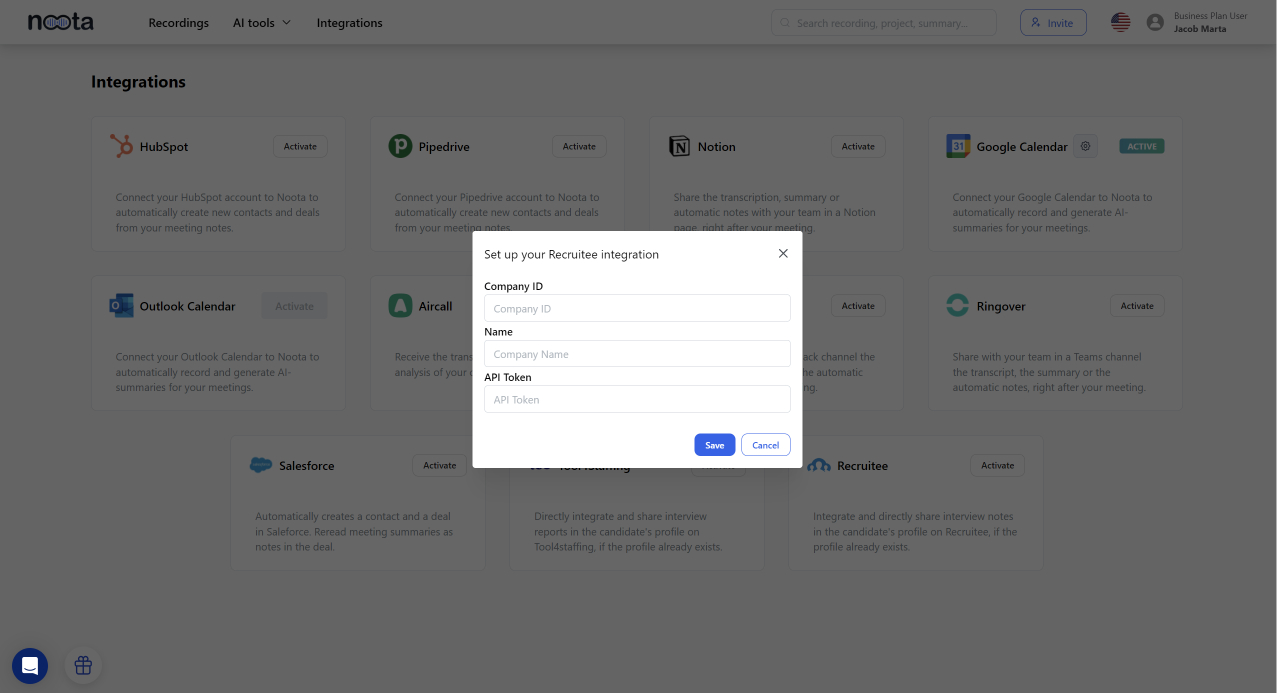 Votre tableau de bord Noota devrait maintenant afficher Recruitee comme une intégration active, prête à améliorer votre processus de recrutement.