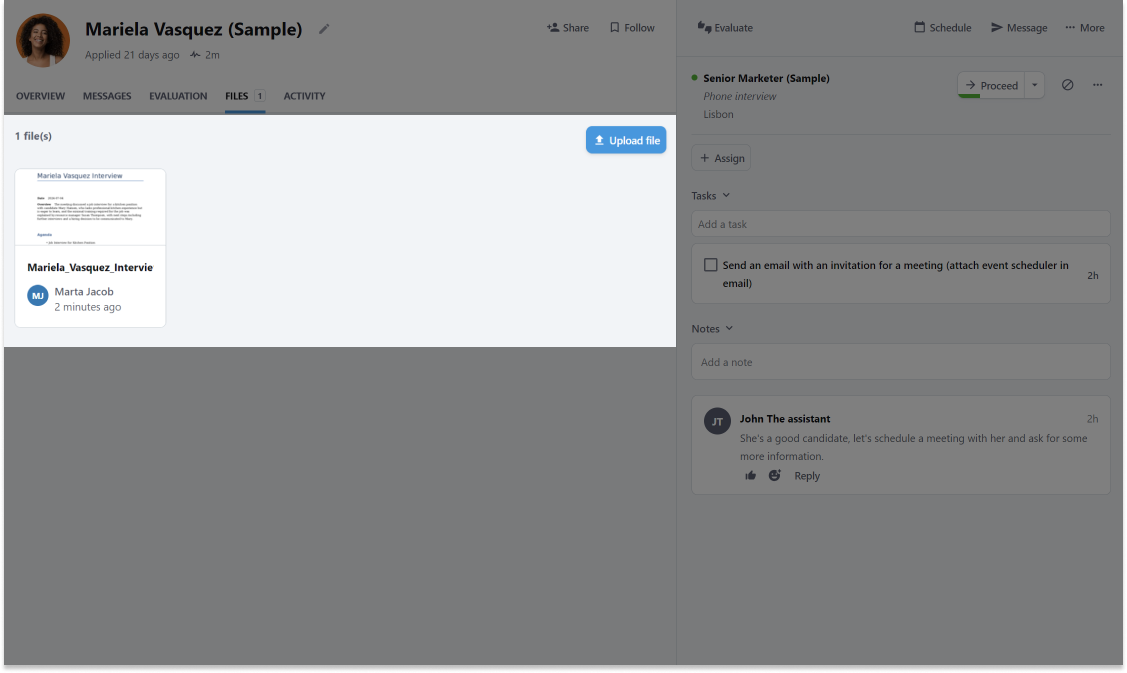 Une fois partagé, le résumé de l'entretien sera accessible (sous Fichiers) dans Recruitee pour une révision et une collaboration faciles.