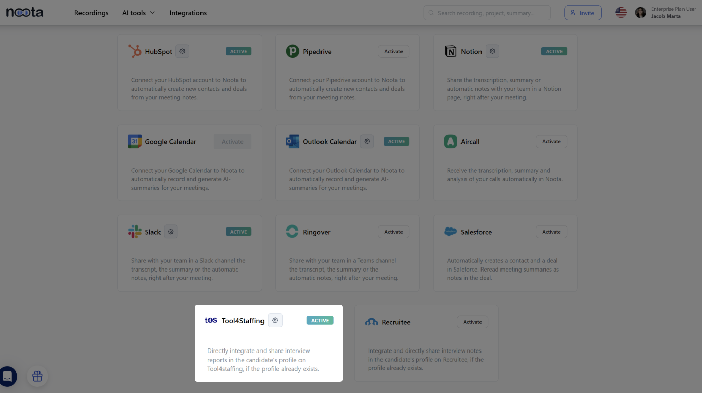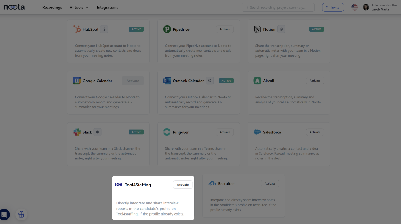 Votre tableau de bord Noota devrait maintenant afficher Tool4Staffing comme une intégration active, prête à améliorer votre processus de recrutement.