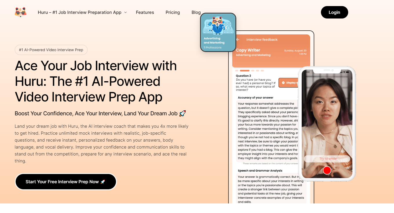 - Huru : Propose un nombre illimité d'entretiens simulés avec des questions générées par l'IA sur des sites d'emploi populaires tels que LinkedIn et Indeed. Il fournit des commentaires instantanés et des conseils de réponse, aidant les candidats à se préparer minutieusement et sans frais.