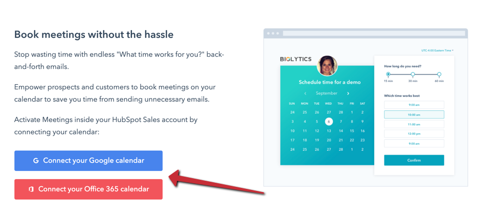 Tout d'abord, vous devez associer HubSpot à votre calendrier existant afin que la disponibilité soit précise et que les réservations soient synchronisées automatiquement. Naviguez vers Paramètres → Général → Calendrier et choisissez Google/Gmail ou Office 365.