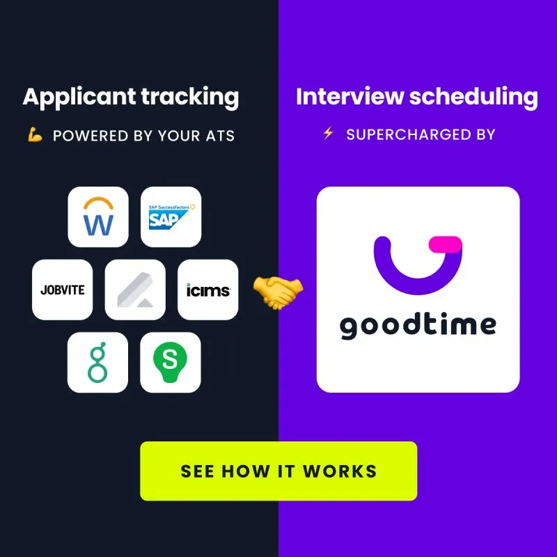 Si vous êtes submergé par la coordination des entretiens, GoodTime est un outil autre que l'ATS qui se connecte à votre pile et automatise le levage de charges lourdes. Pensez à la planification intelligente des entretiens, à la coordination des panels et aux flux de travail des recruteurs qui se synchronisent avec votre ATS sans copier-coller. Vous conservez votre ATS ; GoodTime le rend simplement plus rapide.